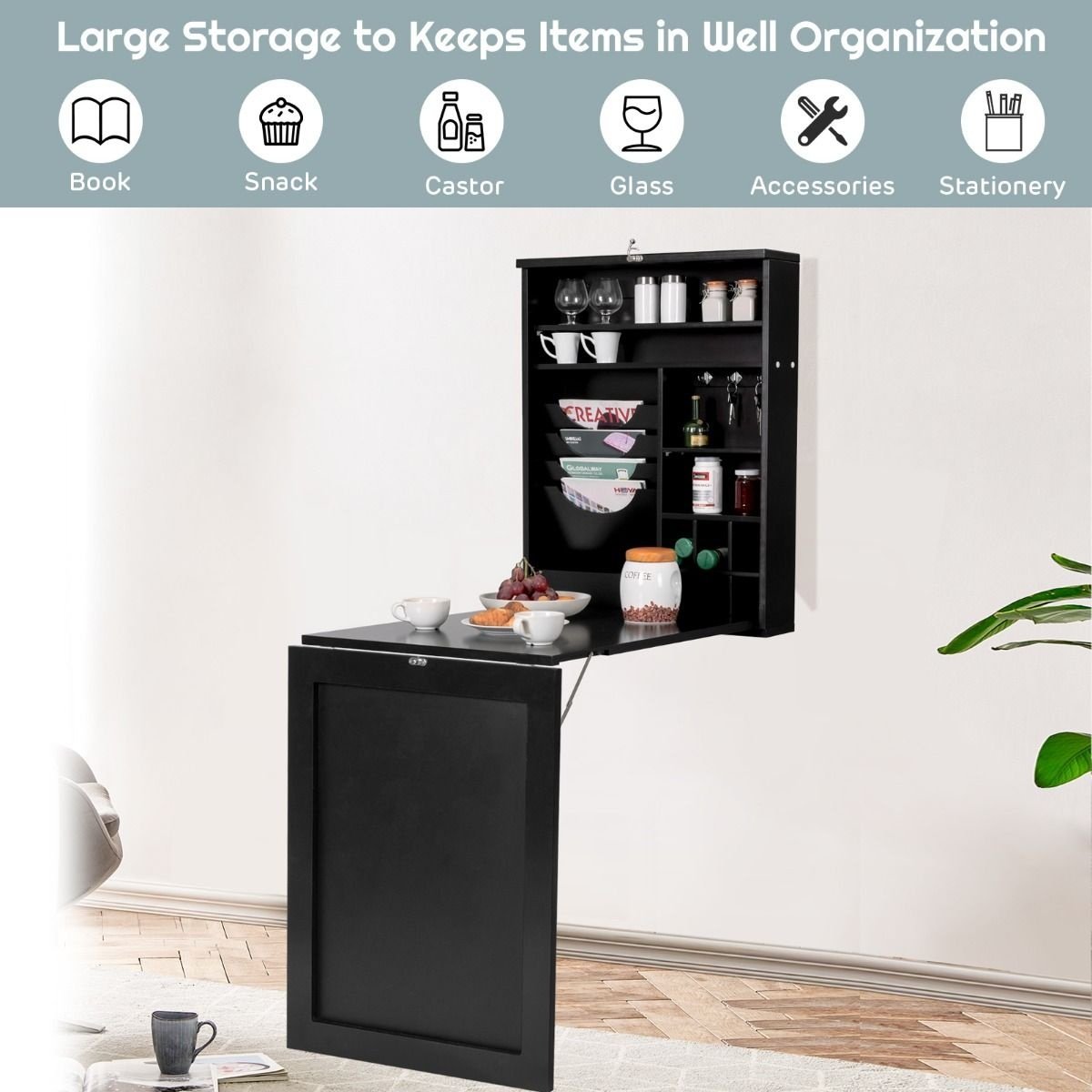 La surface belle et lisse offre un endroit confortable et pratique pour travailler et manger. L'armoire à compartiments multiples permet de ranger tous les objets de manière ordonnée. Les étagères réglables vous permettent d'utiliser au mieux l'espace pour des objets de formes et de hauteurs différentes. De plus, la conception murale est parfaite pour les endroits étroits, maximisant l'espace au sol et permettant une utilisation raisonnable de l'espace. Lorsqu'elle n'est pas utilisée, vous pouvez facilement la plier pour la rendre plus compacte, ce qui permet d'économiser beaucoup d'espace. Plus important encore, la table murale a un design élégant et classique, qui ne manquera pas d'apporter une touche de mode dans votre maison.