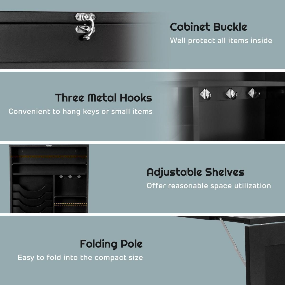 Une construction solide et un artisanat de première classe?Fabriquée en matériau MDF de première qualité, la table murale est suffisamment stable et robuste pour une utilisation à long terme. La boucle en métal sur le dessus accroche solidement la planche, de sorte que tous vos articles essentiels soient bien conservés. La quincaillerie de haute qualité répond également aux besoins d'une utilisation quotidienne.