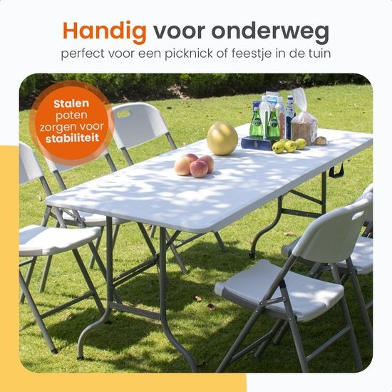 La table pliante est idéale pour diverses occasions, telles que les fêtes, les anniversaires, les barbecues et autres rassemblements. En outre, vous pouvez également utiliser la table pliante au camping. Avec une largeur de 70 cm et une longueur de 180 cm, il y a suffisamment de place !