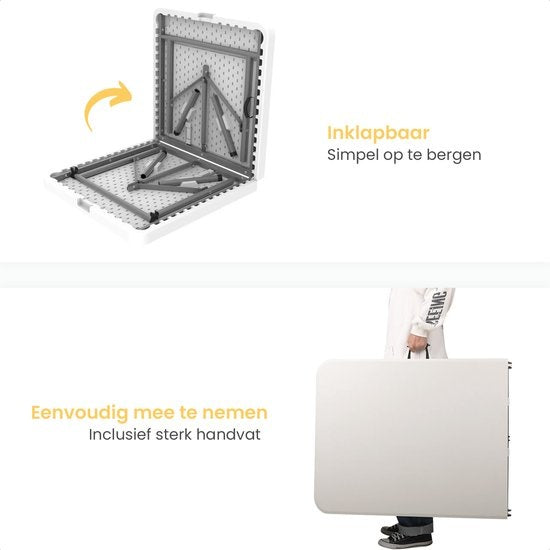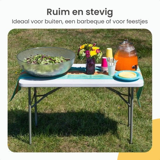 La table pliante est idéale pour diverses occasions, telles que les fêtes, les anniversaires, les barbecues et autres rassemblements. En outre, vous pouvez également utiliser la table pliante au camping. Avec une largeur de 60 cm et une longueur de 122 cm, il y a beaucoup de place !