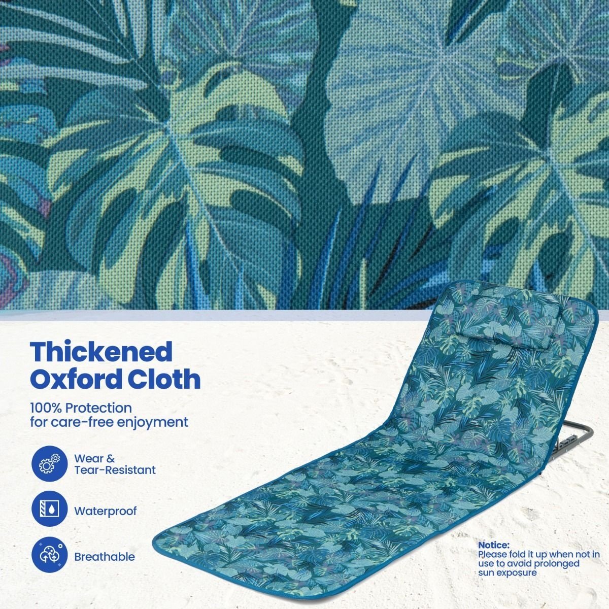 - Dossier réglable en 5 positions : La chaise de plage est dotée d'un dossier réglable en 5 positions, qui assure un confort d'inclinaison optimal. Vous pouvez vous asseoir droit, vous pencher en arrière ou vous allonger, selon vos besoins, comme prendre un bain de soleil, lire des livres ou simplement vous détendre.