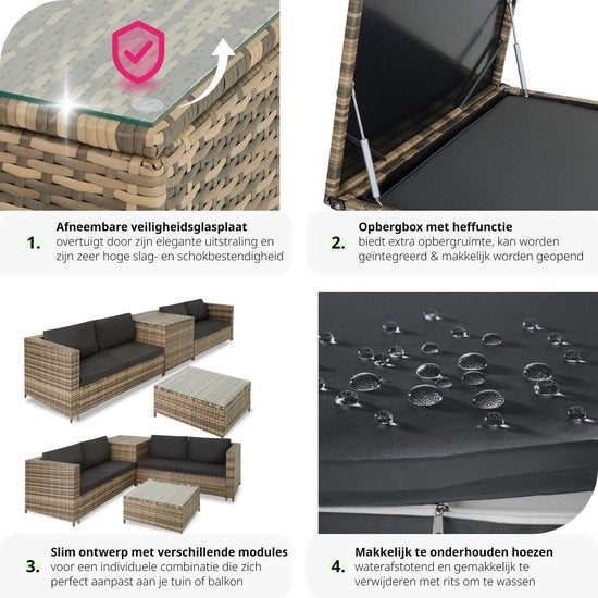 L'ensemble est accompagné d'une boîte de rangement fonctionnelle, idéale pour ranger les coussins ou d'autres articles de jardin, ainsi que d'une table basse équipée d'un élégant plateau en verre (verre de sécurité) facile à nettoyer.