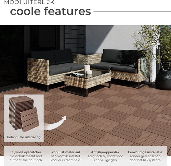 tectake® WPC wood tiles - Dalles aspect bois - Résistant aux intempéries - Sol extérieur - Dalles de sol - Sol de balcon - Dalles de terrasse avec système click - Drain - Lot de 22 - Marron
