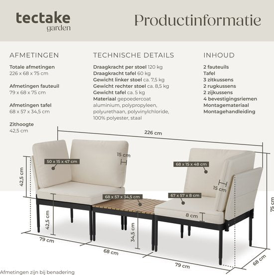 tectake® - Magaluf lounge set - Salon de jardin 5 en 1 avec structure en aluminium - 2 fauteuils de jardin et 1 table basse - Peut être utilisé comme chaise longue, banc d'angle ou banc de jardin 2 places - Coussins inclus - Set de balcon 2 personnes