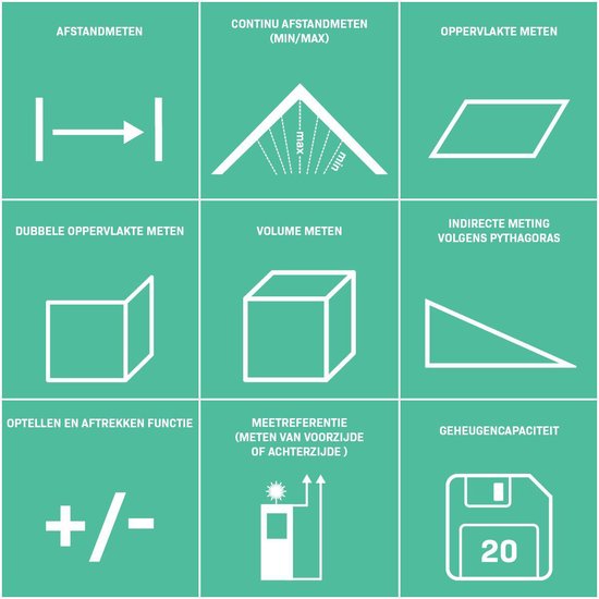 Ce télémètre laser a une portée de 60 mètres et peut mesurer des distances (m1), des surfaces (m2) et des volumes (m3). En utilisant le Pythagore...La fonction de mesure indirecte vous permet de déterminer la hauteur ou la longueur d'objets, comme la hauteur d'un bâtiment. Pour ce faire, vous mesurez la distance diagonale entre l'appareil et le point le plus haut, puis la distance horizontale jusqu'au point le plus bas.Mesure rapide de la surface