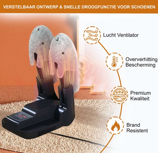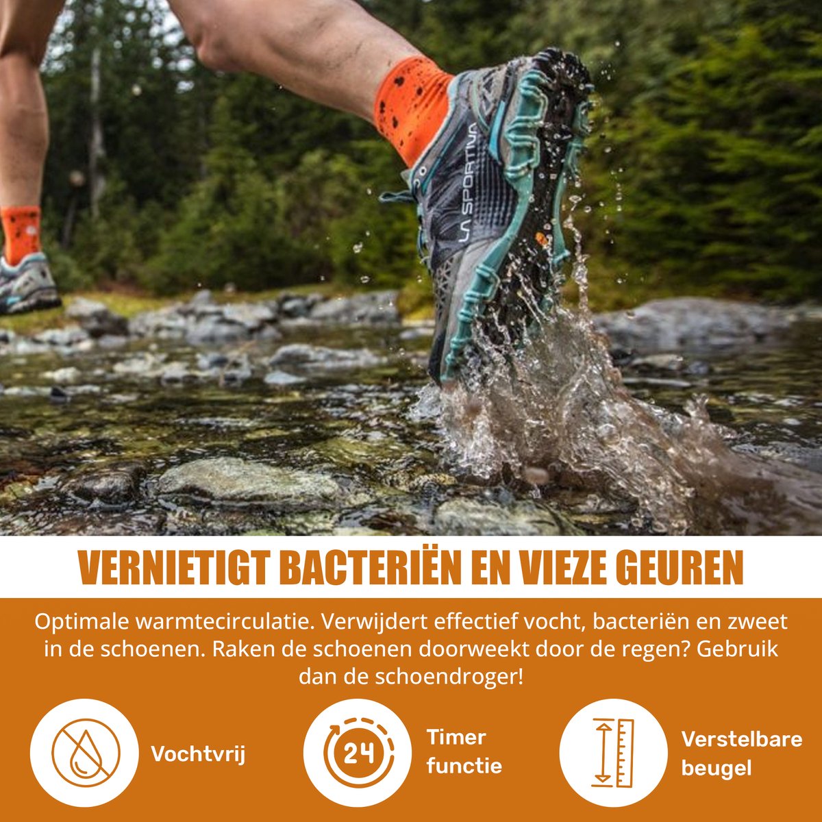Placez vos chaussures sur l'appareil et après 20 minutes, elles seront complètement sèches et nettoyées. Grâce à la minuterie, vous pouvez définir une durée pendant laquelle l'appareil passera au nettoyage. Il est également possible de régler la température. Outre le chauffage et le séchage des chaussures, le sèche-chaussures a également pour fonction d'éliminer les mauvaises odeurs de vos chaussures. Grâce à la fonction unique Ozone , les odeurs désagréables, les bactéries et les moisissures sont éliminées. Vos chaussures restent ainsi fraîches, hygiëniques et sèches en permanence!