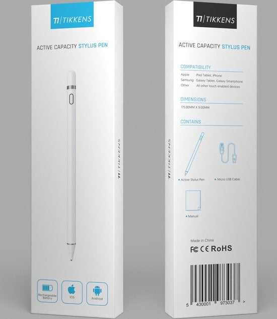 Le stylet TIKKENS Active Stylus vous donne la sensation d'un véritable stylo. Son design fin, élégant et professionnel vous permet de tirer le meilleur parti de votre tablette avec un minimum d'effort. Grâce au port de charge USB et à la batterie intégrée, vous pouvez utiliser ce stylet jusqu'à 15 heures sans charge. Aucune connexion Bluetooth n'est nécessaire, le stylet est prêt à être utilisé immédiatement. Il suffit de déballer l'emballage, de l'allumer et de commencer à créer ! Également disponible en noir.