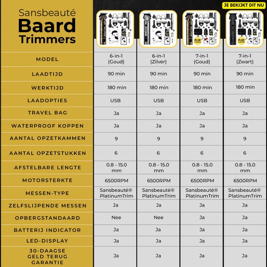 Avec votre achat, vous recevrez un E-book rempli d'astuces pour une coupe optimale, compilées par la Team Sansbeauté. Dans l'e-mail des trucs et astuces, vous trouverez une vidéo montrant comment changer les embouts, ainsi qu'un manuel en néerlandais pour plus d'explications. Vous avez d'autres questions ? N'hésitez pas à nous contacter via : support@sansbeaute.nl ! En prime, vous recevrez avec votre achat un peigne et un sac de rangement pour tous vos peignes et accessoires. Gardez votre salle de bain organisée et élégante. Investissez dans un look soigné avec la tondeuse à barbe Sansbeauté 7-en-1!