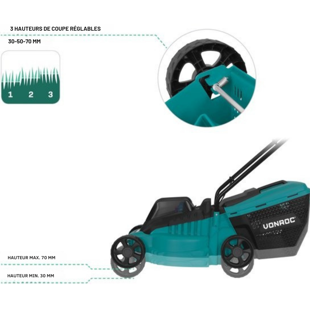3 hauteurs de coupe : 30 / 50 / 70 mm