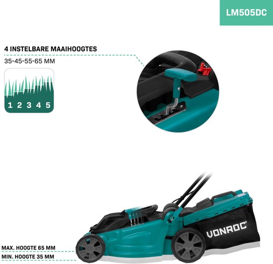 La LM505DC est dotée d'un puissant moteur de 40V alimenté par deux batteries VONROC VPower de 20V. Ensemble, elles fonctionnent comme une seule résistance, ce qui vous permet de compter sur des performances durables et constantes. Ce que l'on remarque immédiatement, c'est à quel point le moteur est silencieux et souple - pour une tondeuse à gazon, il est remarquablement silencieux. La hauteur de coupe est réglable sur 35, 45, 55 ou 65 mm, ce qui permet de choisir facilement la longueur idéale pour votre pelouse. Le bac de ramassage spacieux de 45 litres peut être replié, ce qui vous permet de le ranger de manière compacte après utilisation - très pratique !