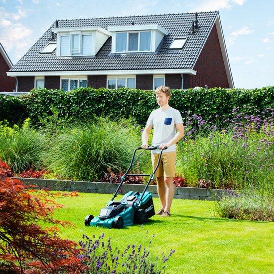 Le boîtier durable est conçu pour une utilisation intensive et à long terme. Les grandes roues offrent une expérience de conduite confortable, même sur des surfaces inégales. Après utilisation, vous pouvez facilement ramener la machine dans la remise en mode transport, sans que les lames ne touchent le sol. Vous pouvez facilement replier la poignée, ce qui permet un rangement compact de la tondeuse.