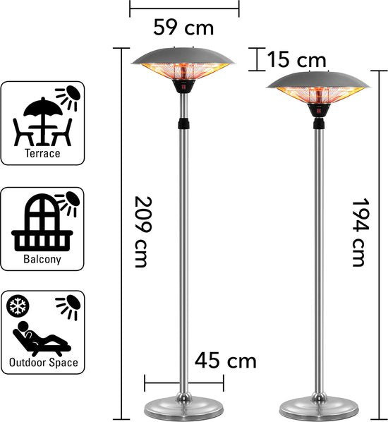 Même le plus beau des étés s'achève. Le design élégant du chauffage radiant à infrarouge est un excellent choix en tant que source de chaleur polyvalente. Le design élégant du chauffage radiant de haute qualité s'intègre parfaitement à tout type d'intérieur. Le réflecteur en forme de champignon et la base sont en aluminium mat et brillant, et la hauteur est facilement réglable grâce à la fonction télescopique.Tang est en acier inoxydable. La base de l'appareil est en acier inoxydable.