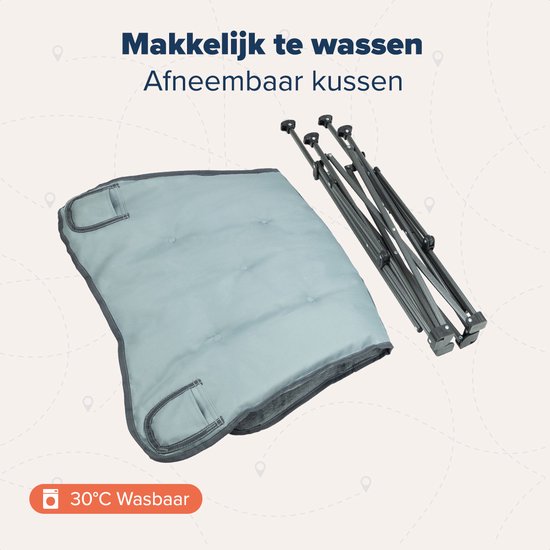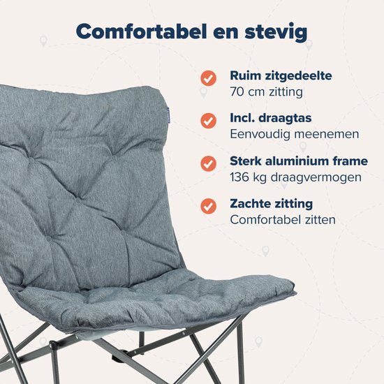 Avec une capacité de charge de 135 kg, cette chaise de camping convient à presque tout le monde. Les pieds antidérapants offrent une stabilité supplémentaire sur différentes surfaces. Que vous soyez assis sur de l'herbe, du carrelage ou du sable, cette chaise se tiendra toujours fermement. Le siège... La housse est facile à enlever et à nettoyer, ce qui donne à votre chaise un aspect toujours frais et propre. Parfaite pour une utilisation intensive pendant vos vacances en camping ou dans votre propre jardin.
