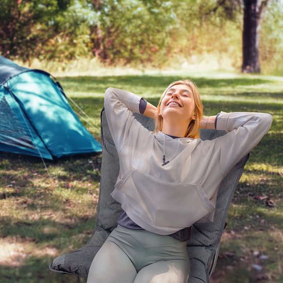 Cette chaise de camping réglable est conçue pour un confort optimal. Le cadre ergonomique, associé au coussin de 7 cm d'épaisseur, garantit une expérience d'assise agréable.Un coussin de 7 cm d'épaisseur garantit des heures de confort en position assise. Avec une hauteur d'assise parfaite de 49 cm, vous pouvez facilement vous asseoir et vous relever. Le dossier robuste offre un excellent soutien à votre dos, tandis que l'assise extra-large de 82 cm offre suffisamment d'espace pour se détendre. Vous pouvez ainsi profiter pleinement de votre repos bien mérité en camping.