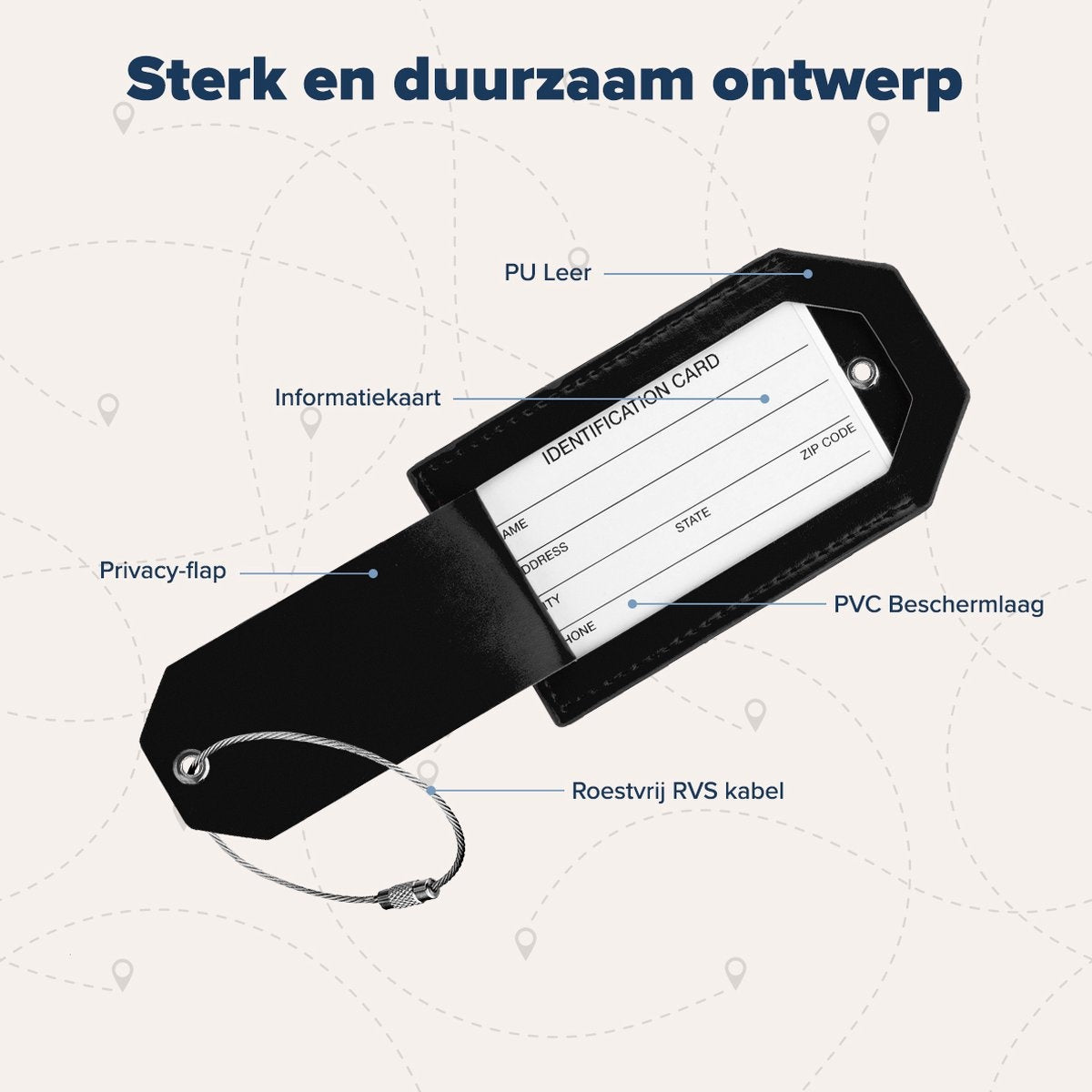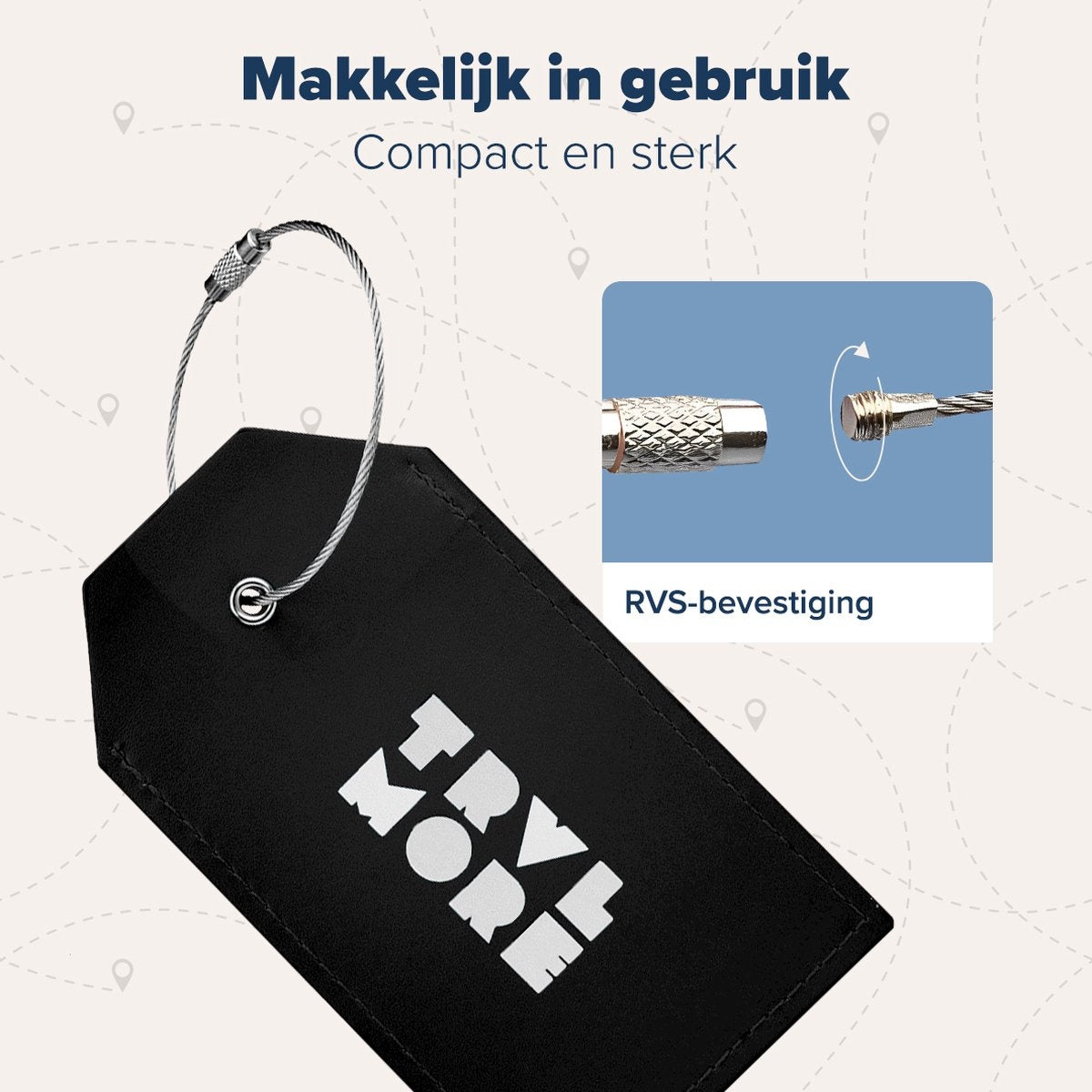 Les étiquettes de valise TRVLMORE sont fabriquées en cuir PU, un matériau extrêmement souple, résistant et durable. C'est un avantage pour les passagers qui se déplacent dans le ciel et sur la sangle à bagages. Le câble de fixation en acier inoxydable permet de fixer très facilement les étiquettes de valise sur votre valise, votre sac (de voyage), votre sac à dos ou tout autre type de bagage.