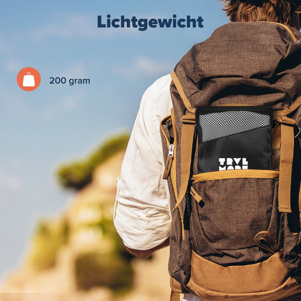 Cette serviette de TRVLMORE sèche cinq fois plus vite qu'une serviette ordinaire, pèse cinq fois moins et absorbe même cinq fois son propre poids. Au lieu d'une lourde serviette de bain en coton qui ne sèche pas, ces serviettes vous permettent d'utiliser une serviette fine et douce sans avoir à attendre longtemps avant qu'elle ne sèche.