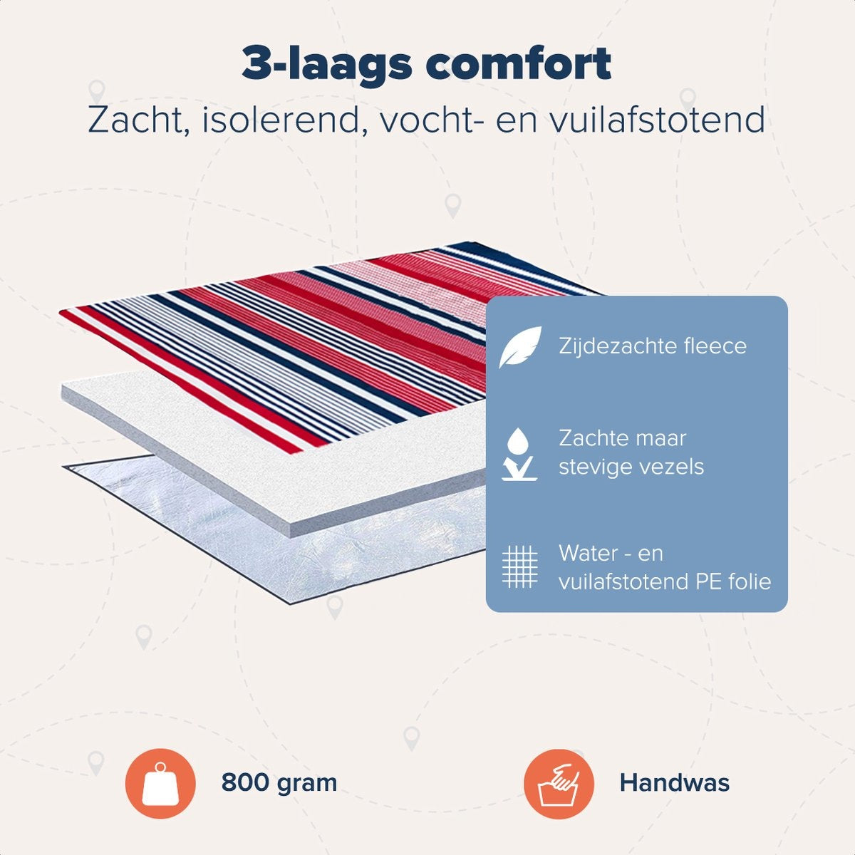 Le tapis se compose de trois couches différentes. La couche supérieure est en polaire douce et soyeuse et est extrêmement confortable pour s'asseoir et s'allonger. Au milieu, il est rembourré avec des fibres, ce qui le rend plus ferme et plus doux. Le dessous de la couverture de pique-nique est recouvert d'une couche d'aluminium isolante, imperméable et déperlante. Elle repousse également le sable et la saleté, ce qui la rend facile à nettoyer !
