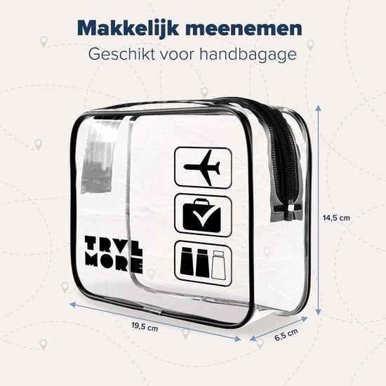 Cette trousse de toilette transparente de TRVLMORE est vraiment idéale pour les voyages. Elle se glisse facilement dans un bagage à main et peut être passée à la douane. La spacieuse trousse de toilette transparente est solide, étanche et, bien sûr, transparente. Une vue d'ensemble plus rapide et meilleure de toutes vos affaires est difficilement envisageable ! Et c'est mieux pour l'environnement, car vous n'avez plus besoin de sacs refermables ! Vos avantages Entièrement transparente Lot de 2 Compartiment de rangement spacieux et pratique 100% étanche à l'eau et aux fuites Fermeture éclair robuste Trousse de toilette transparente Cette trousse de toilette transparente et spacieuse de TRVLMORE offre tout l'espace nécessaire pour ranger vos produits de maquillage, de soin ou de toilette essentiels ! Grâce au cadre solide de la trousse de toilette, vous pouvez utiliser l'espace au maximum. De plus, grâce au matériau transparent, vous avez une bonne vue d'ensemble de tout ce qui se trouve dans la trousse en un coup d'œil ! Imperméable et étanche La trousse de toilette est fabriquée en PVC très épais. Elle est donc 100 % étanche à l'eau et aux fuites et durera très longtemps. Le matériau rend également la trousse très facile à nettoyer. Si un objet s'ouvre dans la trousse de toilette, le reste de la valise reste intact et la trousse peut être nettoyée en quelques minutes ! La trousse de toilette TRVLMORE est entièrement transparente, ce qui constitue une alternative idéale aux sacs en plastique à fermeture à glissière et est donc beaucoup plus respectueux de l'environnement. Emballez à l'avance tous vos produits de maquillage, de soin ou de toilette afin de les placer sur le tapis roulant à la douane en quelques secondes. Cela permet d'économiser beaucoup de temps et d'efforts ! Contenu de l'emballage Trousse de toilette transparente (2x) Autres spécifications Imperméable : Oui Étanche : Oui Carry-on / Bagage à main : Oui