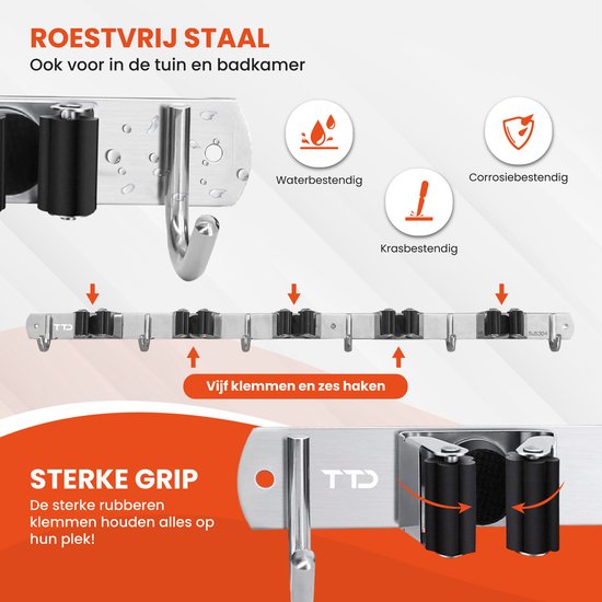 TTD® Luxe XXL Porte-balai et système de suspension pour outils - Porte-balai auto-adhésif - Porte-outils - Nettoyage - 5 crochets de suspension et 6 pinces à outils - Système de rangement - Outils de jardin - Bricoleurs - 62 CM - Acier inoxydable - Ruban