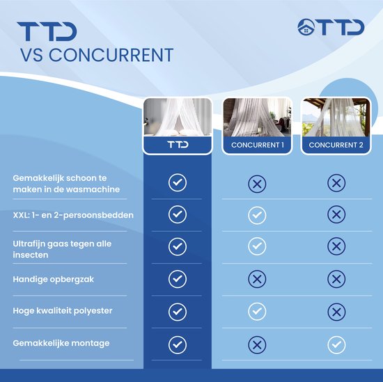 La moustiquaireTTD est spécialement conçue pour vous protéger des insectes, tout en donnant un élégant look à votre chambre à coucher. Que vous ayez un lit king-size ou un lit plus petit, la moustiquaire TTD XXL s'adapte à pratiquement tous les lits et offre une excellente protection et confort.confort. Plus de moustiques gênants qui perturbent votre sommeil, mais une indisturbed nuit de relaxation.