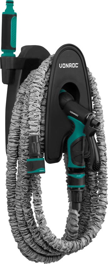 Ce tuyau d'arrosage de VONROC est vraiment étonnant ! Lorsque vous branchez le tuyau au robinet, sa longueur est multipliée par trois et atteint 20 mètres. Dès que vous fermez le robinet, le tuyau se raccourcit automatiquement. Le tuyau est ainsi facile à soulever et à ranger grâce au support mural fourni. Ce support est facile à fixer au mur et vous pouvez enrouler le tuyau autour de lui très facilement.