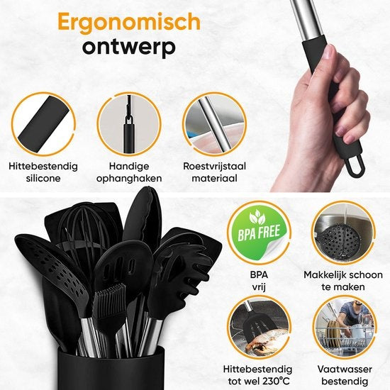 Curieux de cuisiner, mais il vous manque les bons ustensiles ? Cet ensemble d'ustensiles de cuisine 43 pièces contient tout ce dont vous avez besoin ! Avec un matériau de haute qualité, un porte-batterie inclus et un design élégant, vous transformerez votre cuisine avec un seul ensemble. Cuisiner, griller ou plutôt cuire au four ? Cet ensemble en silicone peut vraiment tout faire. Cuillères, pinces, tasses à mesurer et spatules les plus fines. Cet ensemble polyvalent a tout pour plaire!