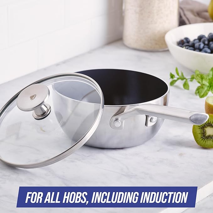 Batterie de cuisine Tri-Ply en acier inoxydable céramique antiadhésive 16 cm / 1,2 L avec couvercle, Tri-Ply, sans PFAS, multicouches, induction, lavable au lave-vaisselle, va au four, argenté
