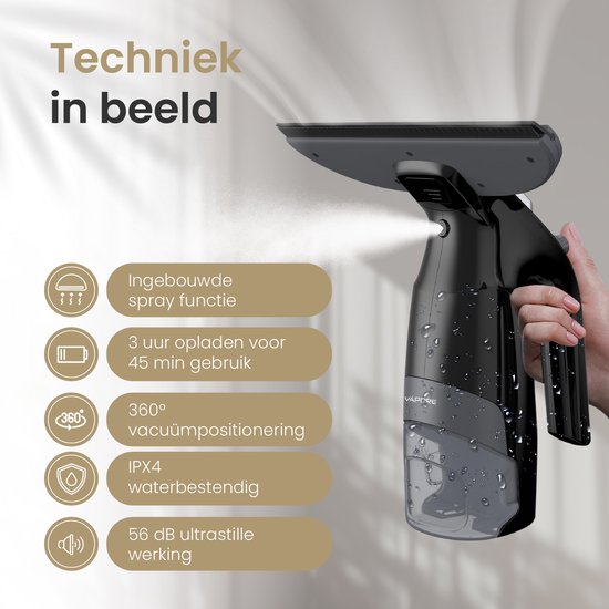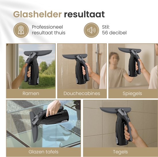 Nous savons...La frustration est réelle : ces traînées indésirables après avoir nettoyé vos vitres, les gouttes d'eau qui finissent sur le sol et les mouvements de va-et-vient fatigants avec différents chiffons. Avec le nettoyeur de vitres électrique Vapore, ces problèmes appartiennent au passé. D'un seul geste, vous vaporisez, essuyez et aspirez l'eau sale. Quel est le résultat ? Des vitres magnifiquement nettes en une fraction du temps. La raclette spacieuse de 28 cm vous permet de traiter une plus grande surface par mouvement, ce qui vous permet de terminer plus rapidement. Et surtout, vos sols restent secs, ce qui vous évite de devoir passer la serpillière. Commandez dès aujourd'hui et découvrez à quel point le lavage de vitres peut être facile.