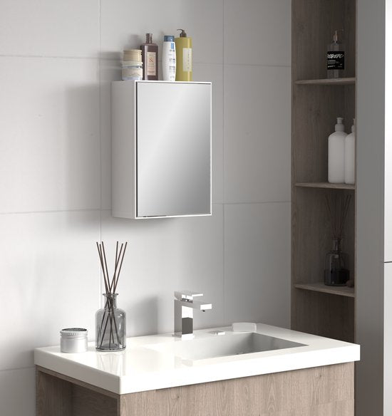Cette élégante armoire de toilette en blanc est parfaite pour être placée au-dessus du lavabo de la salle de bain ou sur les toilettes. Derrière la porte miroir, vous trouverez beaucoup d'espace pour ranger les articles de toilette et les produits de soins personnels de manière élégante et organisée.