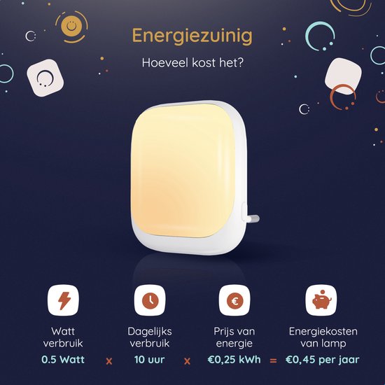 Les veilleuses ne consomment que 0,5 W par heure, ce qui revient à moins de 1 euro par an ! Les coûts énergétiques sont déjà très élevés. Avec les veilleuses à faible consommation d'énergie de Numsy, vous économisez des coûts élevés inutiles én vous obtenez seulement plus de sommeil en retour.