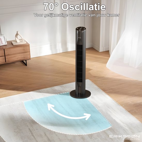 Vous aimeriez vous endormir avec une douce brise, mais vous ne voulez pas que le ventilateur tourne toute la nuit ? Outre un mode sommeil, le ventilateur à tour Erikssøn dispose également d'une fonction de minuterie réglable jusqu'à 12 heures. Vous décidez vous-même au bout de combien de minutes le ventilateur doit s'éteindre. De plus, le ventilateur est silencieux, avec un niveau sonore de seulement 39 dB. Grâce à la fonction d'oscillation, le ventilateur tourne automatiquement à gauche et à droite dans un rayon de 70°. Ce que contient la boîte: