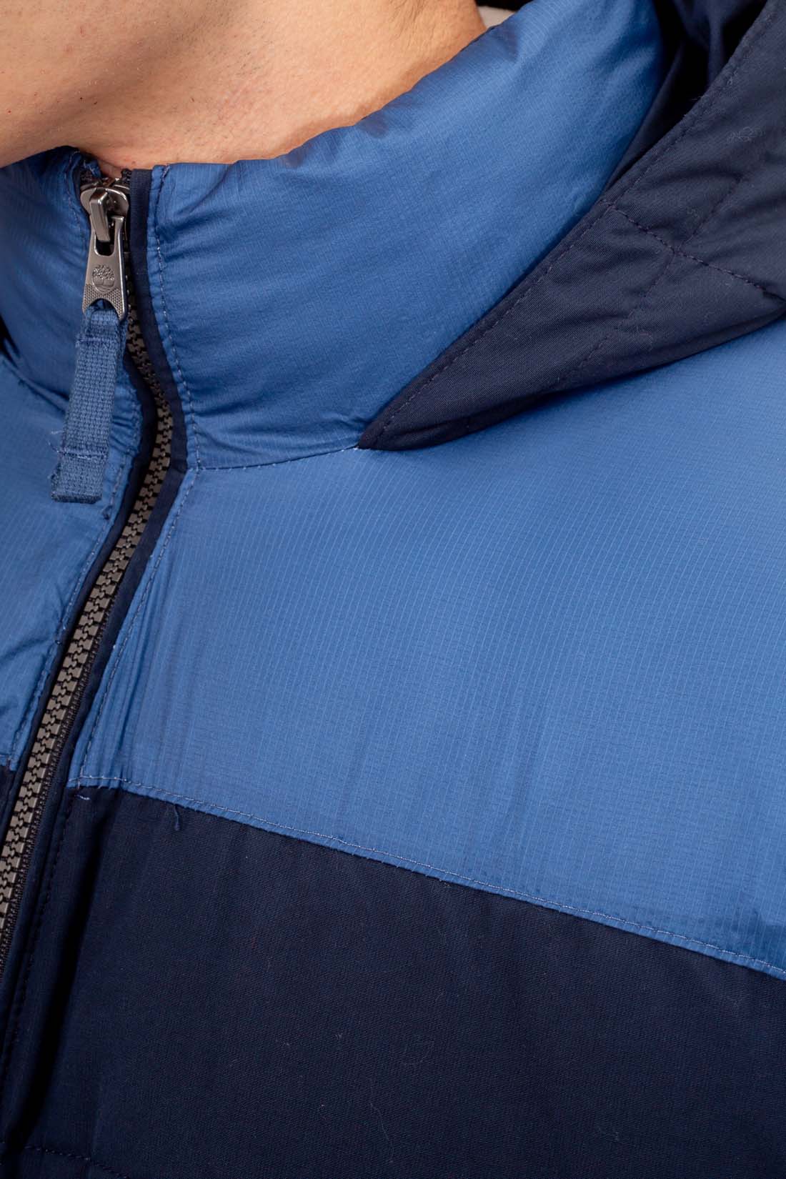 Fabriquée en coton canvas bleu marine avec des détails en nylon ripstop, cette doudoune dispose d'une fermeture à glissière sur toute la longueur et du logo Timberland cousu sur la manche.