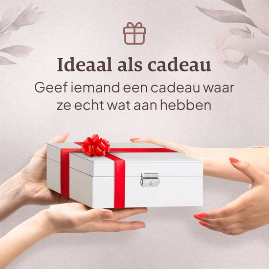Maintenez vos bijoux organisés de manière élégante avec cette boîte à bijoux. Cette boîte de rangement de luxe comporte deux couches et une disposition personnalisable des compartiments, offrant suffisamment d'espace pour tous vos bijoux, tels que bagues, colliers, bracelets et boucles d'oreilles. L'extérieur est en faux cuir de haute qualité avec une finition hydrofuge, de sorte que vos bijoux sont protégés de manière optimale contre la poussière et l'humidité.