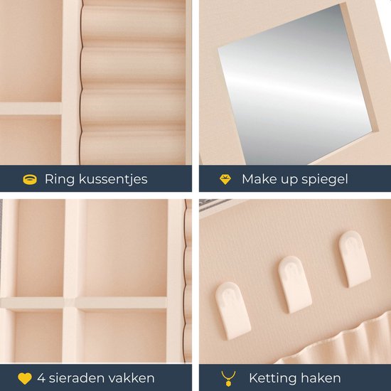 Rangez et organisez vos bijoux avec élégance grâce à la boîte à bijoux Vimora. Cette boîte élégante et compacte est dotée d'un extérieur en velours et d'un miroir pratique à l'intérieur, ce qui la rend parfaite pour une utilisation à la maison ou en déplacement. Avec sa couleur beige intemporelle, elle s'adapte à tous les styles et ajoute une touche élégante à vos accessoires.