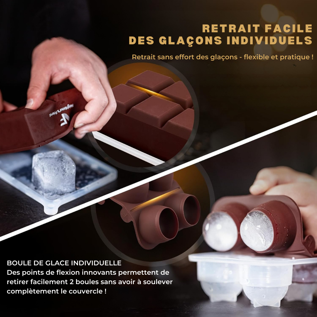- FACILITE D'UTILISATION: Grâce au design ingénieux des moules à glace, le remplissage et le retrait de chaque boule et bloc sont extrêmement simples. Parfaites pour les boissons fortes, en été comme en hiver!