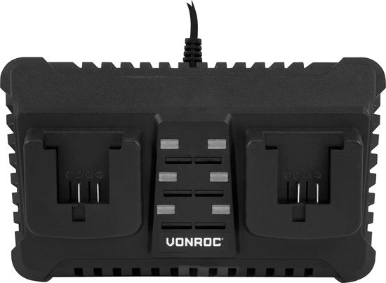 VONROC Chargeur rapide double pour charger vos batteries VPower 20V. Il est également possible de charger une seule batterie de 20V. Le chargeur permet de charger plusieurs batteries simultanément, par exemple une batterie 2.0Ah et une batterie 4.0Ah. Ce chargeur est équipé de tous les dispositifs de sécurité électroniques nécessaires que vous attendez de VONROC, tels que la protection contre la surcharge et la surchauffe. Le capteur de charge automatique éteint le chargeur dès que la batterie est pleine et active la charge de maintien pour maintenir la batterie chargée. Le chargeur de batterie dispose d'un indicateur à 3 niveaux avec des LED (vert/orange/rouge) pour montrer l'état de charge. Convient pour un montage mural ; la distance (152,4mm) pour les vis de montage est déjà indiquée sur le boîtier. Très pratique! Ce chargeur est silencieux et ne possède pas de ventilateur bruyant et gênant.