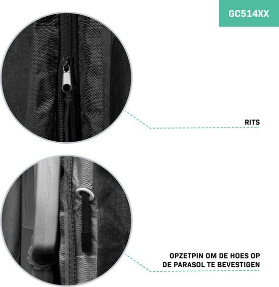 - Doté d'une fermeture éclair avec cordon de serrage, d'une broche de fixation pratique et d'un cordon de serrage qui permettent de glisser facilement la housse sur le parasol et de la fermer hermétiquement.