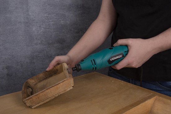 Que vous souhaitiez polir, percer, graver, meuler, couper ou poncer, ce multitool de VONROC est la solution parfaite ! Utilisez-le pour travailler le bois, graver le verre, créer des bijoux ou personnaliser des meubles. Ce multitool peut tourner de 8 000 à 35 000 tours par minute. Grâce à la roue réglable en continu, vous pouvez facilement choisir le réglage qui convient à votre projet.