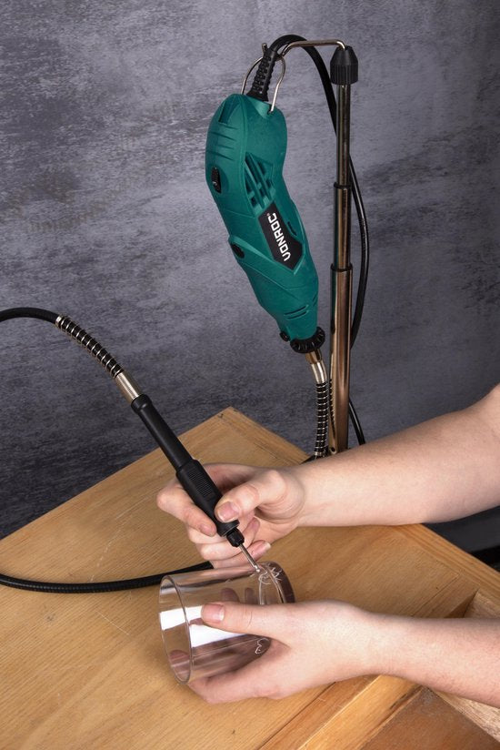 En outre, l'ensemble comprend un capot de protection qui offre une sécurité supplémentaire lors du ponçage et de la découpe des métaux, ainsi qu'un accessoire de gravure/fraisage très pratique. Cet accessoire vous aide à maintenir la machine droite sur le matériau pendant le fraisage ou la gravure.