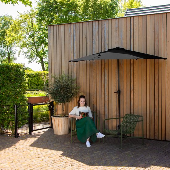 - La forme semi-circulaire vous permet de placer le parasol directement contre le mur. Parfait pour les balcons, les patios, les terrasses ou les petits jardins.