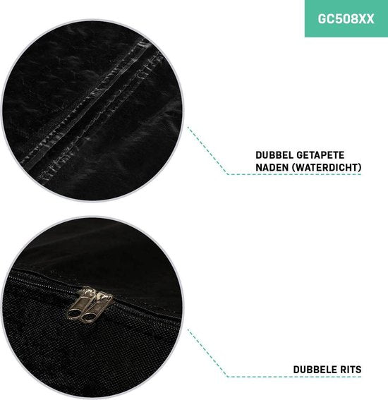 - Le matériau est imperméable. Toutes les coutures et tous les coins sont protégés par du ruban adhésif pour garantir cette caractéristique. Cependant : la fermeture éclair peut toujours laisser passer de l'eau. Par conséquent, les sacs de rangement autour de la fermeture éclair ne sont pas étanches et nous recommandons de ranger le sac dans une remise, un débarras ou un grenier. Il est donc recommandé de ranger le sac dans une remise, un débarras ou un grenier, mais pas en permanence à l'extérieur.