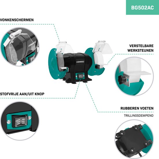 Cette meuleuse de table est alimentée par un moteur à induction de 250W. Ce moteur puissant garantit une vitesse constante de 2980 tr/min, nécessite peu d'entretien et produit relativement peu de bruit. Le boîtier est en métal, ce qui le rend solide et durable. La machine est en outre équipée de porte-outils facilement réglables, dont l'un est doté d'un bord biseauté, idéal pour affûter les ciseaux, les couteaux, etc. Pour un environnement de travail sûr, la meuleuse de table est équipée de deux capots de protection réglables, d'un interrupteur marche/arrêt anti-poussière et de pieds en caoutchouc pour absorber les vibrations. En bref, une meuleuse robuste et pratique qui suffira dans tous les ateliers.