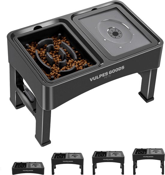 Vulpes Goods® Pets - Bol à nourriture pour chien avec support - Bol à boire pour chien anti-éclaboussures - Bol anti-mâchouillement pour chien - Bol à nourriture surélevé - 4 hauteurs - Mangeur lent - Double - Noir