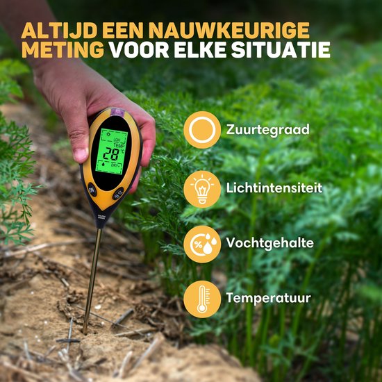 Vulpes Goods® Humidimètre pour plantes - 4 en 1 - hygromètre - intérieur et extérieur - hygromètre pour plantes d'intérieur - - pH, photomètre, thermomètre et humidimètre - Humidimètre pour sol - Version PRO - Batterie incluse