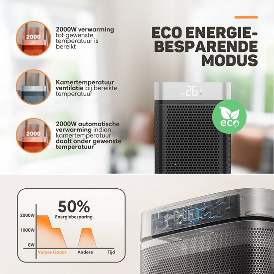Expérimentez maintenant le poêle électrique le plus compact, le plus puissant et le plus économe en énergie sur bol.com ! Convoquez une chaleur agréable dans n'importe quelle pièce jusqu'à 30m2 en quelques secondes avec le réchaud électrique Vulpes Goods® Tech. Grâce à sa puissance de 2 000 W, vous obtiendrez une température agréable en seulement 2 secondes. Vous avez le choix entre trois niveaux de chaleur : Haute (2000W), Normale (1350W) ou mode ECO. Le mode Eco est particulièrement économe en énergie, ce qui vous permet d'économiser encore plus sur les coûts énergétiques élevés, et vous pouvez régler vous-même la température de la pièce avec précision grâce au thermostat intelligent intégré. Grâce à la fonction de rotation à 70 degrés, le poêle en céramique chauffe efficacement tous les coins de la pièce. Le ventilateur de l'appareil de chauffage est facile à contrôler à l'aide des boutons situés sur l'appareil lui-même ou à distance avec la télécommande incluse. Parfait pour votre maison, votre bureau ou votre chambre à coucher!