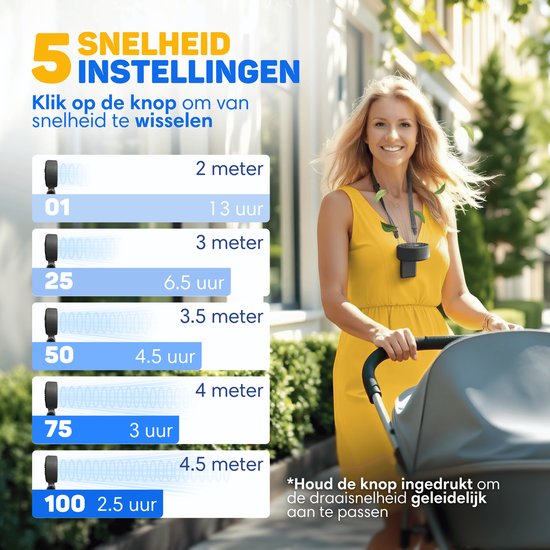 Avec un débit d'air puissant pouvant atteindre 4,5 mètres par seconde, cinq vitesses réglables et un design polyvalent 3-en-1 (ventilateur à main, ventilateur de bureau ou ventilateur de cou), vous pouvez toujours profiter d'un rafraîchissement parfait, où que vous soyez.