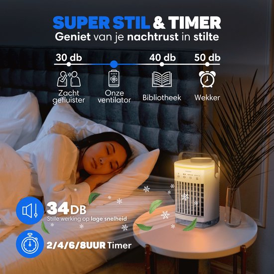 Sur la base des commentaires de nos fidèles clients, nous avons mis au point le Mini Airco Pro. Pour nous, il est essentiel que le climatiseur soit aussi silencieux que possible et que vous ayez la possibilité de régler une minuterie, afin que vous puissiez vous endormir avec le climatiseur sans être dérangé et sans inquiétude. Notre climatiseur a un niveau sonore d'environ 34dB.d pour que vous puissiez dormir sans être dérangé et avec la fonction de minuterie, vous vous endormirez l'esprit tranquille.