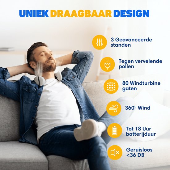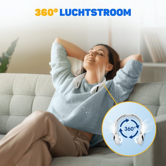 Ce ventilateur est doté de 60 doubles pales, ce qui génère plus de flux d'air et pousse l'air plus fort hors de l'échappement. Grâce aux valves de sortie d'air, l'air est réparti uniformément autour de votre cou et de votre tête. Le flux d'air est autour de votre cou, gardant tout votre tour de cou merveilleusement frais ! Grâce à son léger et à son design compact, le ventilateur est facile à emporter ou à ranger dans un sac.