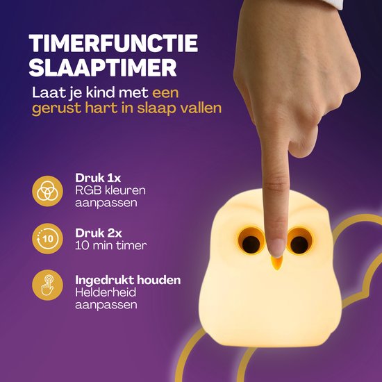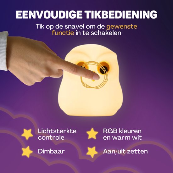 Vous pouvez facilement dim la lumière en appuyant sur le bec, ce qui rend facile le réglage de la luminosité. La couleur de la lumière peut également être modifiée sans effort entre la lumière blanche, la lumière blanche chaude et les couleurs RVB ! Utilisez le bouton "interrupteur" situé en bas de la veilleuse pour ce faire. La lumière dispose également d'une minuterie de 10 minutes, que vous pouvez facilement activer en appuyant deux fois sur le bec !