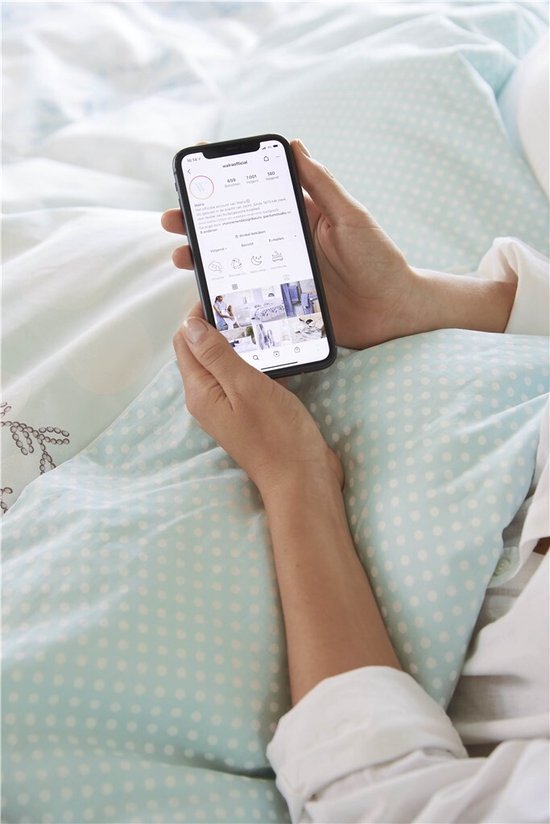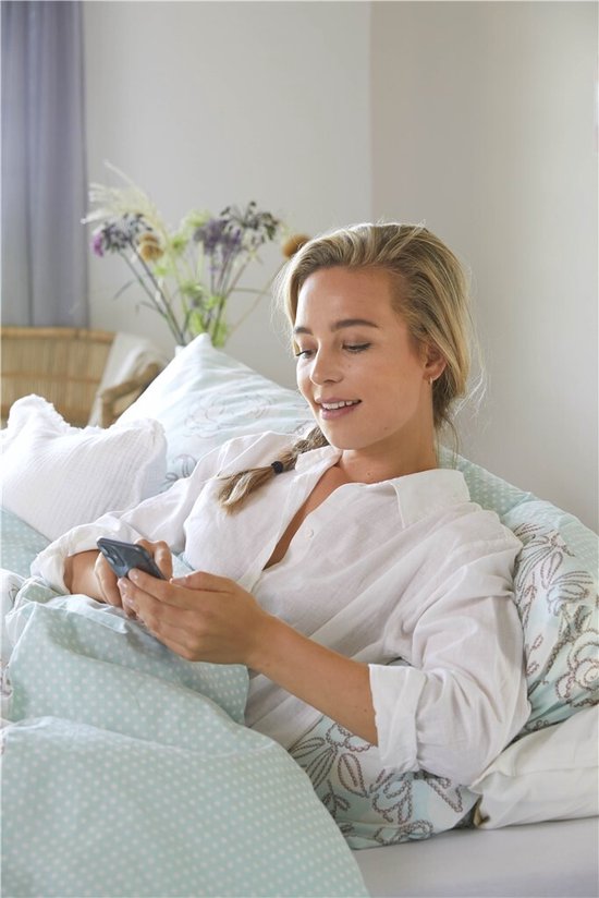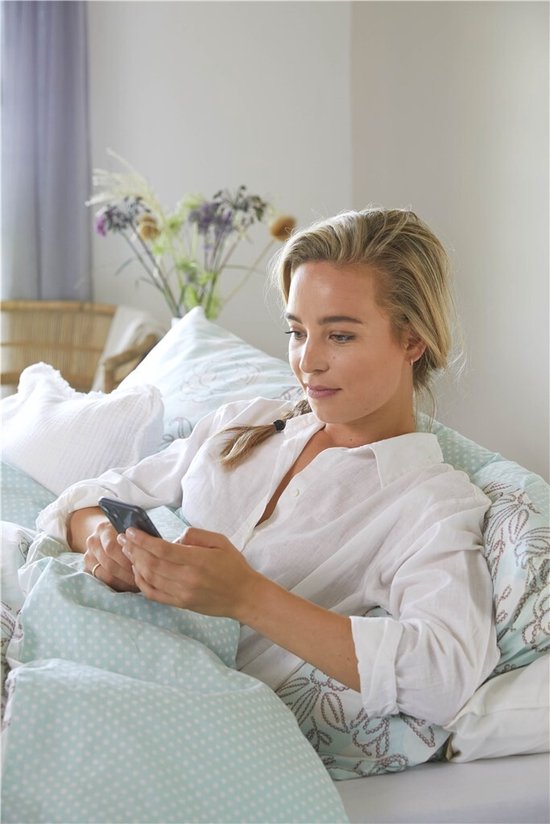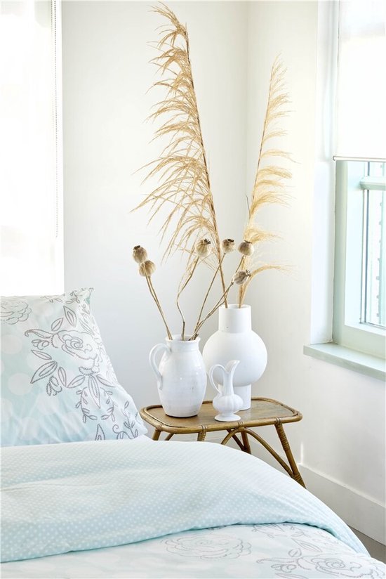 Cette housse de couette inspirée du style Liberty est audacieuse. Le motif bleu clair présente de délicats pois blancs, associés à un motif floral sophistiqué. Certaines de ces fleurs sont décorées d'un motif perlé, ce qui ajoute une touche romantique à votre chambre à coucher. L'envers est orné de petits pois blancs, créant un effet ludique.